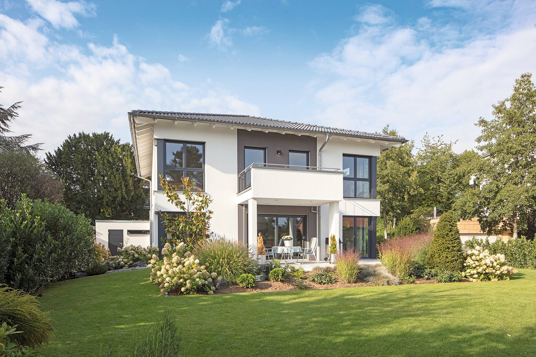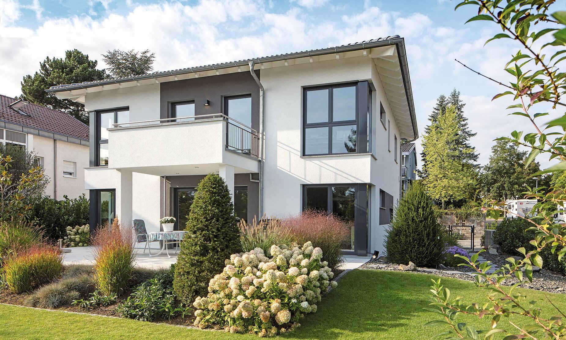Das Stadthaus mit seinen zwei Vollgeschossen und dem Walmdach bietet eine Wohnfläche von rund 220 Quadratmetern. Der Balkon, der durch zwei Säulen gestützt wird, sowie der schön angelegte Garten unterstreichen das imposante Erscheinungsbild. Farbige Akzente und Fensterrahmen in Grau lockern die ansonsten weiße Außenfassade auf. Passend dazu haben sich die Hausbesitzer für graue Dachziegeln entschieden.