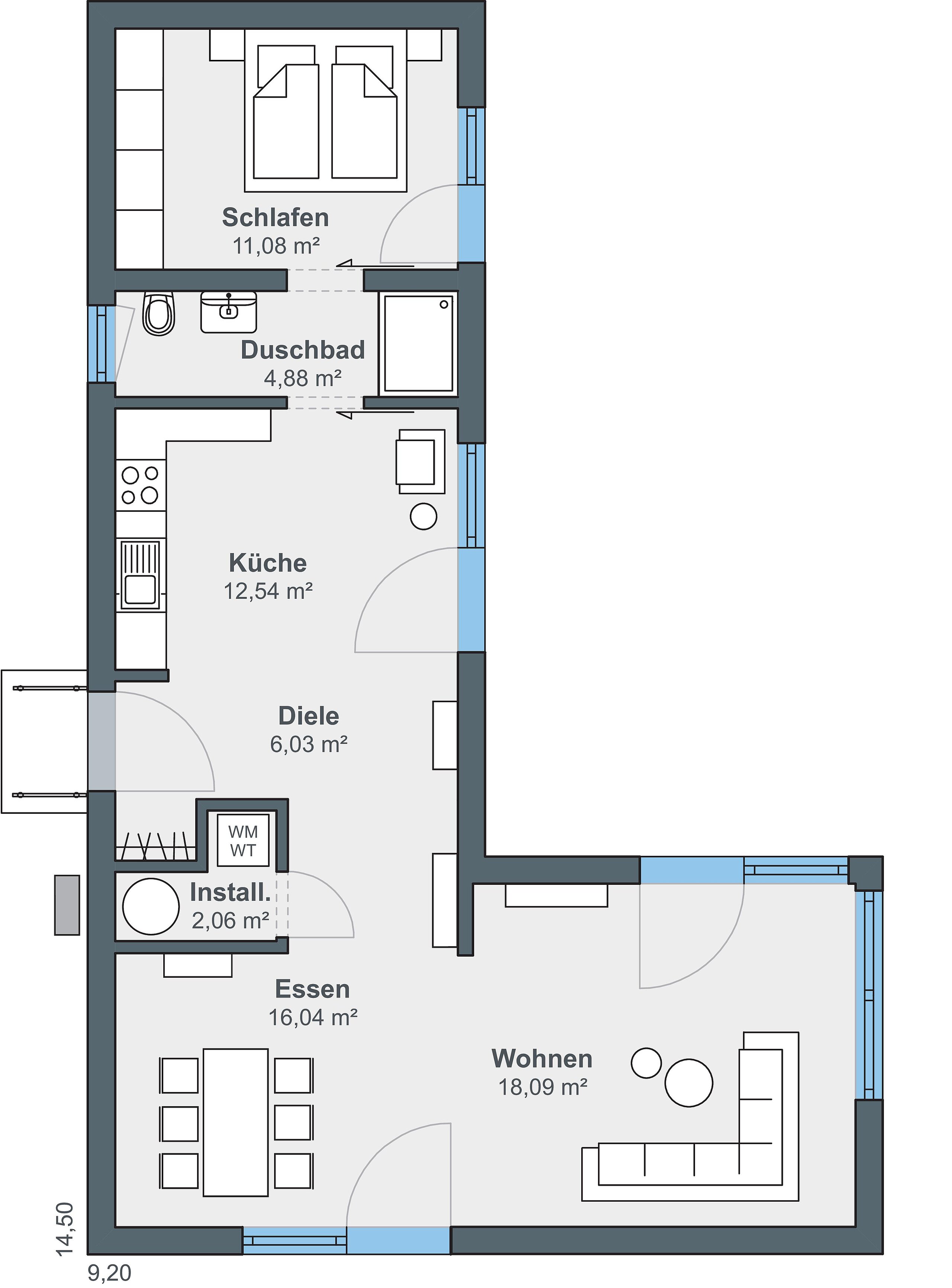 Der Bungalow ist mit modernem Flachdach oder mit einem partiellen Satteldach erhältlich. Unabhängig von der gewählten Dachform lässt sich jede Ausführung mit dem neuen Anbaumodul kombinieren. Die klare Architektur, kompakte Bauweise und durchdachte Raumaufteilung bleiben dabei erhalten und bieten eine intelligente Lösung für alle, die bewusst auf weniger Raum wohnen und dennoch Wert auf Komfort und Gestaltungsfreiheit legen.