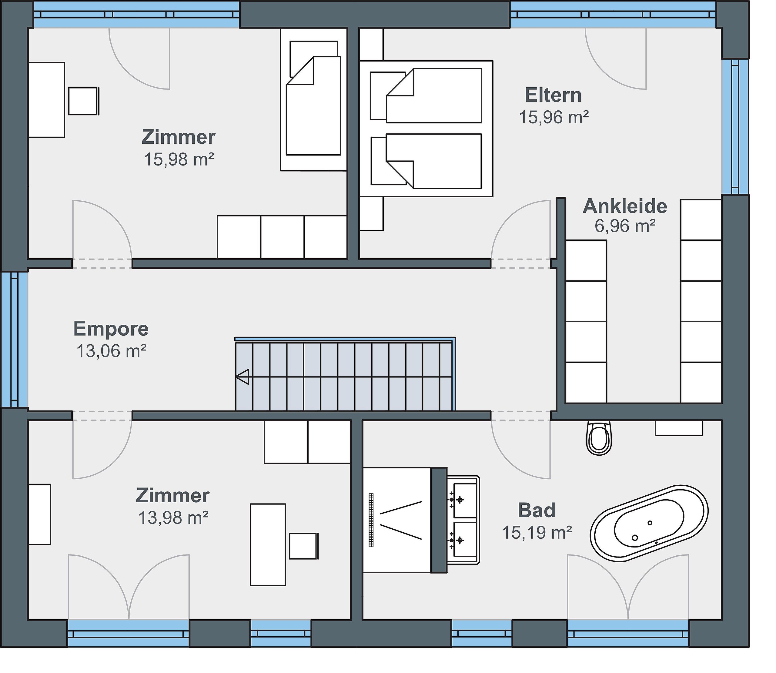 Das Obergeschoss empfängt die Bewohner mit einer luftigen Galerie. Neben dem Master-Bedroom mit geräumigem Ankleidebereich befinden sich hier oben noch zwei gleich große Schlafzimmer. Mit dem Badezimmer haben sich die Bauherren eine luxuriöse Wellnessoase geschaffen: Highlight ist ohne Zweifel die freistehende schwarze Badewanne, die vor einer schwarzen Wand platziert wurde. Über ihr schwebt eine elegante Hängeleuchte aus Glas. Dank des Monitors an der Wand, der zwischen zwei Fenstern platziert wurde, kann man beim entspannenden Schaumbad seine Lieblingsserie genießen. Die bodengleiche Dusche versteckt sich hinter einem halboffenem Wandelement. Die Vorderseite der Trennwand wird von einem langen Doppelwaschtisch in Betonoptik eingenommen.