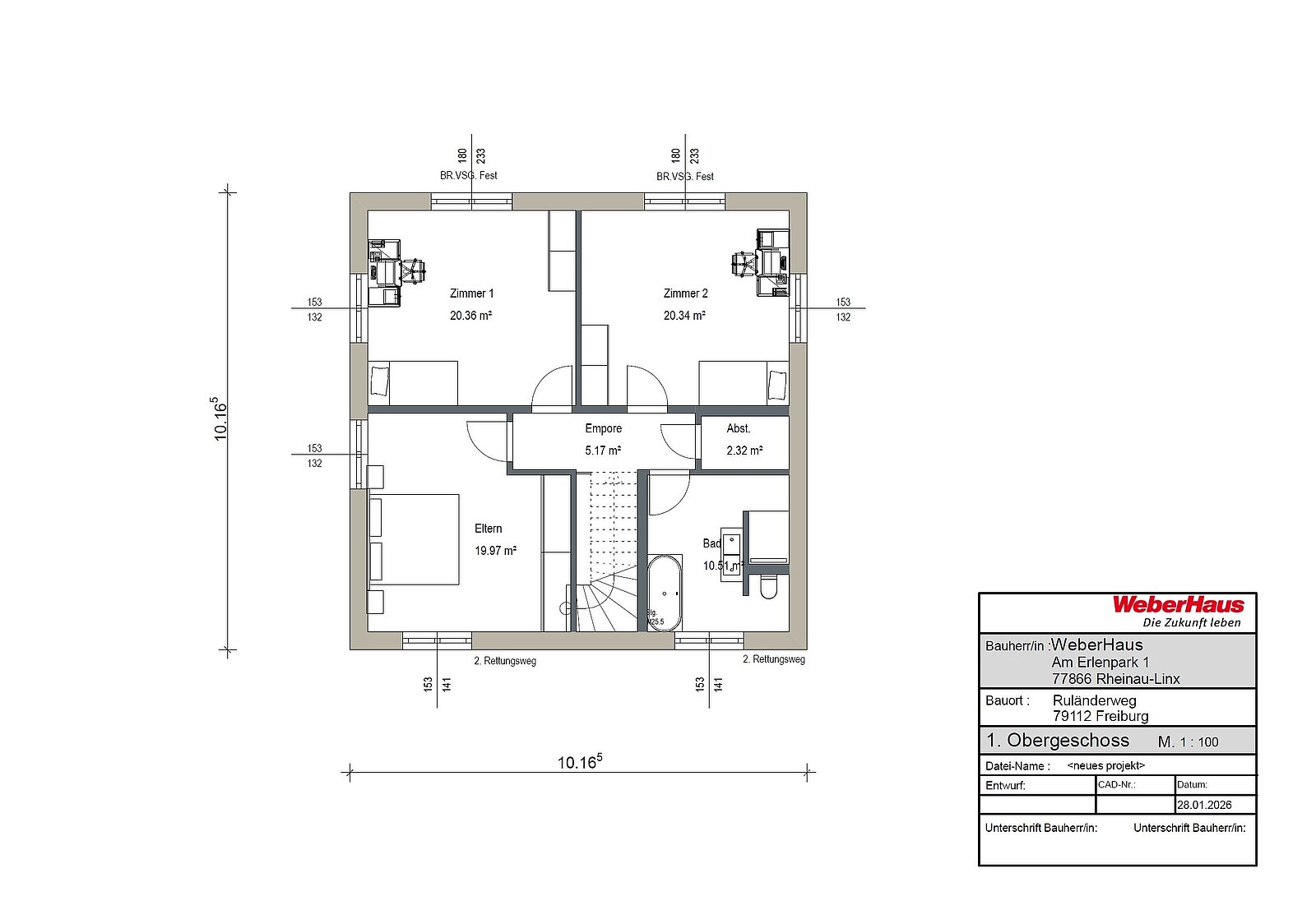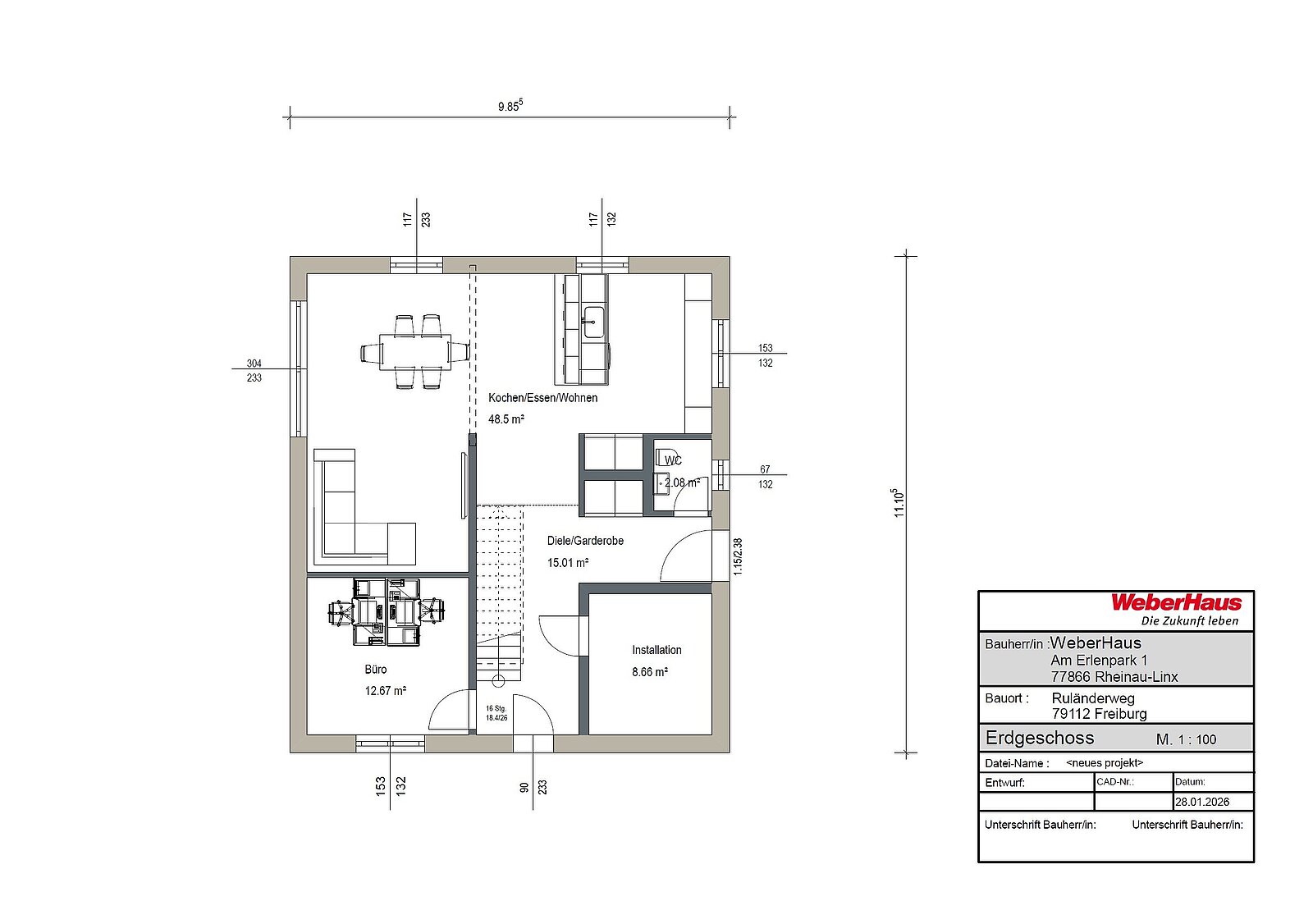 Realisiert werden die Häuser in gehobener Qualität mit WeberHaus als Baupartner. Der Ausstattungsstandard umfasst unter anderem den Effizienzhaus-40-Standard, eine moderne Wärmepumpe, Photovoltaik- und Solartechnik, Fußbodenheizung, hochwertige Parkettböden, bodengleiche Fliesenduschen sowie moderne, energieeffiziente Haustechnik. Nachhaltigkeit, Wohnkomfort und langfristige Wertstabilität stehen dabei im Mittelpunkt.