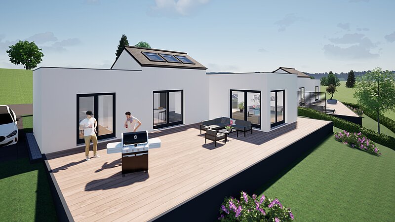 Auf einer Grundstücksfläche von 516 qm entsteht dieser barrierefreie Bungalow mit Anbau auf Bodenplatte in schlüsselfertiger Ausstattung.